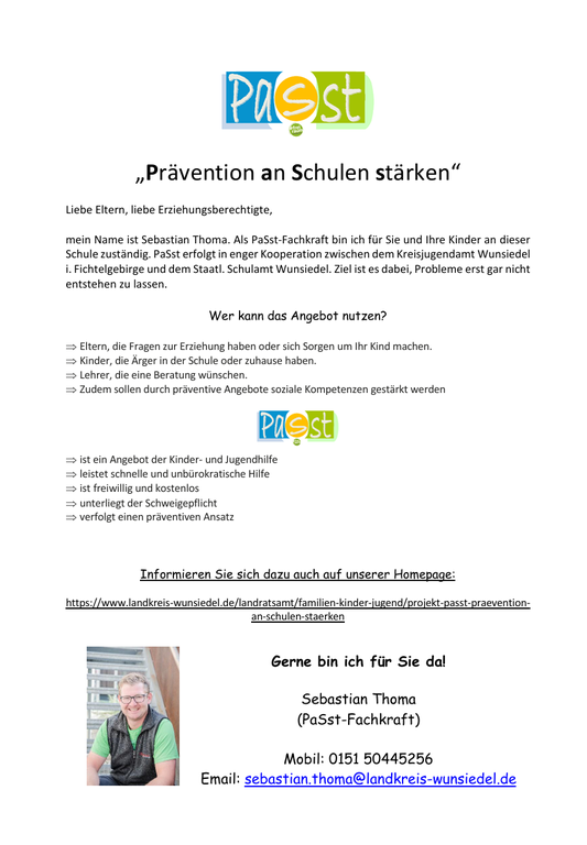 Seit einigen Schuljahren unterstützt uns das Projekt PaSst (Prävention an Schulen stärken) des Landkreises Wunsiedel auch an unserer Schule.